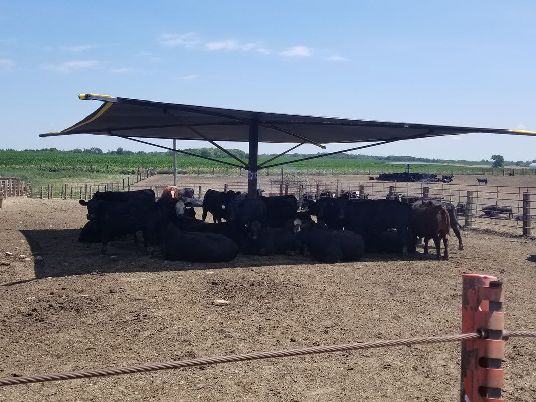 Cattle Shade 34’ x 34’ square self standing cattle shade 3 ton base for maximum stability Heavy 8” square tube main support Heavy 3” x 3” main frame Heavy weight shade fabric for maximum heat reduction Ratchet strap fabric tighteners